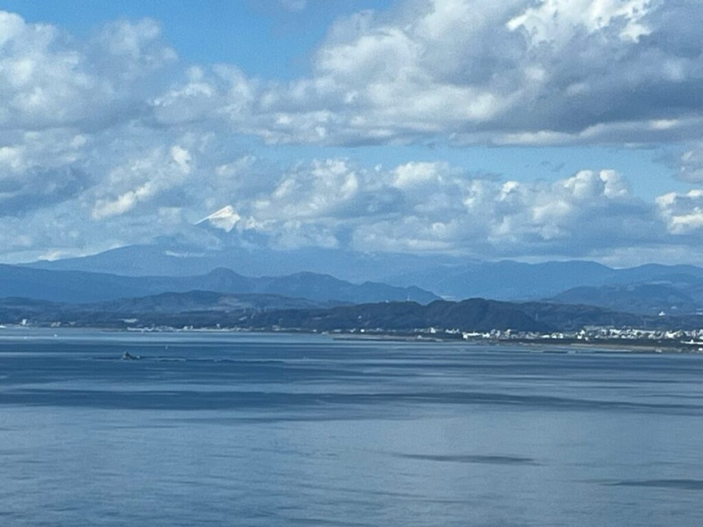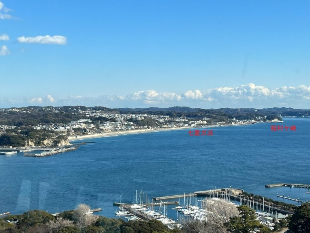 伊豆大島はかなり近くに見えますし、童謡「鎌倉」に出てくる“七里ガ浜の磯伝い 稲村ケ崎名将の 剣投ぜし古戦場”もその通りに見えます。