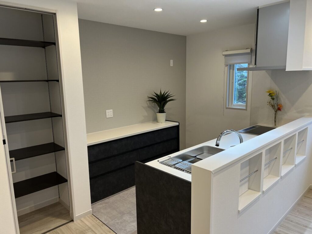キッチンと背面収納の間は1m以上の間隔を設けているので、作業が楽にできます